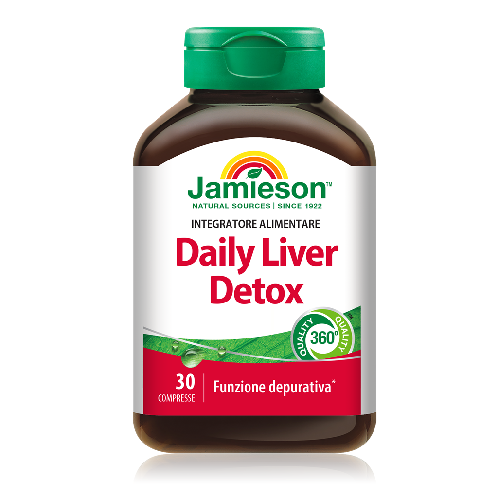 Daily Liver Detox di Jamieson è un integratore alimentare a base di curcuma, carciofo e cardo mariano. Il carciofo e il cardo mariano contribuiscono alla funzione epatica e alla detossificazione dell’organismo. Lavorano in sinergia per supportare la funzione digestiva, aiutando ad alleviare i tipici disturbi causati dalla cattiva digestione. Completa la formulazione la colina, un fattore vitaminico-simile con funzione epatoprotettiva. La colina contribuisce al normale metabolismo dei lipidi ed al mantenimento della normale funzione epatica.